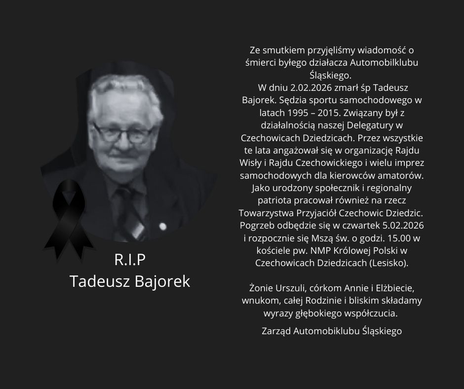 W dniu 2.02.2026 zmarł śp Tadeusz Bajorek. Sędzia sportu samochodowego w latach 1995 – 2015. Związany był z działalnością naszej Delegatury w Czechowicach Dziedzicach. Przez wszystkie te lata angażował się w organizację Rajdu Wisły i Rajdu Czechowickiego i wielu imprez samochodowych dla kierowców amatorów. Jako urodzony społecznik i regionalny patriota pracował również na rzecz Towarzystwa Przyjaciół Czechowic Dziedzic.